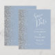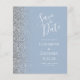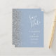Die links Hand dieses eleganten, modernen Hochzeitsgeschehens bewahrt die Dattelkarte mit einem silbernen Imitat Glitzer Rand. Der anpassbare Text kombiniert weiße Handschrift und Copperplate-Schriftart auf einem staubblauen Hintergrund. Die Rückseite ist mit einem passenden dustigen Blau- und Silberdesign versehen.