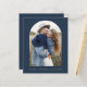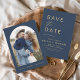 Budget Wedding Navy Blau und Gold Speichern Sie die Date Cards, die ein Foto auf der Vorderseite haben. Die Save the Date-Karten enthalten eine moderne, handgeschriebene, kursive Schriftzeichen-Typografie, die elegant, einfach und modern nach einem einfachen Hochzeitstag-Fest zu verwenden sind.