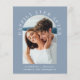 Moderne, preisgünstige, staubblaue Hochzeitseinladung mit Ihrem Foto in einem Bogenrahmen und "Happily Ever After" in eleganter weißer Typografie. Fügen Sie Ihre Vornamen, das Hochzeitdatum und den Ort Ihrer Hochzeit hinzu. Auf der Rückseite personalisieren Sie Ihre Einladung in einfacher weißer Typografie.