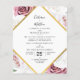 Elegantes blumengeschmücktes Hochzeitstil mit einer rosa Rosa-Blume mit einem geometrischen Rahmen mit Goldeffekt. Aus der Kollektion "Moderne Flora und Geometrie" zeigt dieses wunderschöne und raffinierte Layout Ihre Hochzeitsdetails in einem stilvollen Drehbuch und moderner Typografie mit einem reichen Bouquet auf weißem Hintergrund. Dieses Budget für Hochzeitseinladung ist nicht mit einem Umschlag, aber ein A6-Umschlag wäre dafür perfekt geeignet. Auch auf dieser Website verfügbar