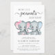 Eine niedliche, preisgünstige Einladung mit Baby-Dusche und "Two Sweet Little Peanuts Are On Your Way" in sanfter grauer Typografie und stilvoller Schrift, pastellblau und rosa Aquarellfarben von Babyelefanten. Personalisieren Sie den Namen der Mutter und Duschdetails in einfachen grauen Typografie.