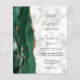 The left-hand edge of this elegant modern wedding invitation features an emerald green watercolor agate border trimmed with faux gold glitter. The customizable text combines gold-colored handwriting script with black copperplate and italic fonts on a gray and white marble background. The reverse side provides spaces for 4 photos (1 square, 2 horizontal, 1 long vertical) and room for your wedding website URL or other information.