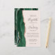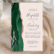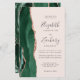 The left-hand edge of this elegant modern wedding invitation features an emerald green watercolor agate border trimmed with faux rose gold glitter. The customizable text combines charcoal gray handwriting, copperplate and italic fonts on a blush pink background. The reverse side features a matching emerald green and rose gold agate design.