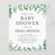 Budget Personalisieren Sie diese moderne Eukalyptus Watercolor Greenery Spring Style Baby Dusche Einladung auf weißem Hintergrund mit Ihrer Nachricht und Details. Diese stilvolle Einladung beinhaltet modernes und elegantes botanisches Grün mit stilvoller Schrift-Typografie für die besondere Mutter zu sein Feiern.