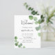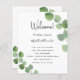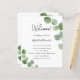 Ein modernes, elegantes Hochzeitsprogramm, Zeitleiste. Weißer Hintergrund, mit Eukalyptusgrün dekoriert, mit Sprigs. Personalisieren und fügen Sie Ihre Namen und Hochzeitsdetails. Schwarze Buchstaben. Wenn Sie mehr Text haben, ist es möglich, den Zeilenabstand zu verringern und auch Text auf der Rückseite hinzuzufügen.