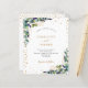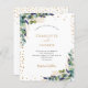 Weiße, mit Eukalyptusgrün, goldgelbem Blattwerk und Herzen dekorierte Unterkunft. Personalisieren und fügen Sie Ihre Namen und Hochzeitsdetails. Schwarze und goldfarbene Buchstaben. Zurück: weißer Hintergrund mit Imitaten goldenen Herzen sprinkle.