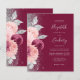 Die links Seite dieses eleganten, modernen Hochzeitseinladens besticht durch ein Blumenstrauß in Bordeaux- und Rosatönen, das mit Silberfolie aus Imitat und Imitaten Glitzer bedruckt und mit silberfarbenem Imitat-Glitzer bestreut ist. Der anpassbare Text kombiniert silbergraue Handschrift, Copperplate und kursiv Schriftart auf bordeauxfarbenem Hintergrund. Auf der Rückseite ist ein passendes bordeauxfarbenes, rot-silberfarbenes Design.