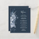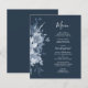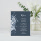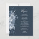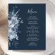 The left-hand edge of this romantic wedding menu features a watercolor floral bouquet of dusty blue flowers and greenery. The customizable text combines handwriting, copperplate and italic fonts in white on a navy blue background. The reverse side is a coordinating solid navy blue.