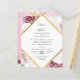 Elegantes blumengeschmücktes Hochzeitstil mit einer rosa Rosa-Blume mit einem geometrischen Rahmen mit Goldeffekt. Aus der Kollektion "Moderne Flora und Geometrie" zeigt dieses wunderschöne und raffinierte Layout Ihre Hochzeitsdetails in einem stilvollen Drehbuch und moderner Typografie mit einem reichen Bouquet auf weißem Hintergrund. Dieses Budget für Hochzeitseinladung ist nicht mit einem Umschlag, aber ein A6-Umschlag wäre dafür perfekt geeignet. Auch auf dieser Website verfügbar