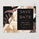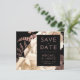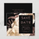 Diese elegante, launische Hochzeit Save the Date-Karte bietet ein üppiges, romantisches Blumenstrauß in Elfenbein mit Rose Gold Imitate Folie und Glitzer Blattwerk auf einem schwarzen Hintergrund. Passen Sie den Rose-farbigen Text in stilvollen Schriftart auf einem schwarzen Rechteck an. Fügen Sie zusätzliche Details auf der Rückseite, und geben Sie Ihre Hochzeitswebsite URL, um einen QR-Code zu generieren.