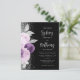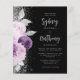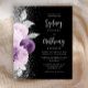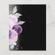 Die links Seite dieses eleganten, modernen Hochzeitseinladens besticht durch einen Blumenstrauß in lila und Lavendeltönen, bestickt mit Silberfolie aus Imitat und Imitat Glitzer und mit silberfarbenem Imitat-Glitzer. Der benutzerdefinierbare Text kombiniert blass-silbergraues Kalligraphieskript und sans serif Schriftart auf schwarzem Hintergrund. Die Rückseite weist ein passendes Blumendesign auf.