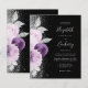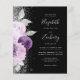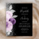 Die links Seite dieses eleganten, modernen Hochzeitseinladens besticht durch einen Blumenstrauß in lila und Lavendeltönen, bestickt mit Silberfolie aus Imitat und Imitat Glitzer und mit silberfarbenem Imitat-Glitzer. Der anpassbare Text kombiniert beige silbergraue Handschrift, Copperplate und kursiv Schriftart auf schwarzem Hintergrund. Die Rückseite weist ein passendes Blumendesign auf.