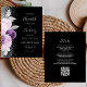 Die links Seite dieses eleganten, modernen Hochzeitseinladens besticht durch einen Blumenstrauß in lila und Lavendeltönen, bestickt mit Silberfolie aus Imitat und Imitat Glitzer und mit silberfarbenem Imitat-Glitzer. Der anpassbare Text kombiniert beige silbergraue Handschrift, Copperplate und kursiv Schriftart auf schwarzem Hintergrund. Fügen Sie zusätzliche Details auf der Rückseite, zusammen mit einem QR-Code, um Ihren Gästen zu helfen, besuchen Sie Ihre Hochzeitswebsite.