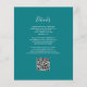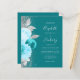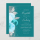 Die links Seite dieses eleganten, modernen Hochzeitseinladens besticht durch einen Blumenstrauß in türkisfarbenen und hellblauen Farbtönen, besticht durch silberne Imitate und Imitate Glitzer und besticht durch einen Glitzer aus silbernen Imitaten. Der individuell anpassbare Text kombiniert handgeschriebene, hellsilbergraue Schrift, Copperplate und kursiv Schriftart auf türkisfarbenem Hintergrund. Fügen Sie zusätzliche Details auf der Rückseite, zusammen mit einem QR-Code, um Ihren Gästen zu helfen, besuchen Sie Ihre Hochzeitswebsite.