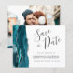 Diese elegante Save the Date-Karte verfügt über eine aquamarine blaue Aquarellgrenz mit Imitaten silbernen Glitzer bestickt. Der anpassbare Text kombiniert handgeschriebene handgeschriebene handgeschriebene handgeschriebene Schriften aus Holzkohle, Copperplate und kursiv auf weißem Hintergrund. Ersetzen Sie das Beispielbild auf der Rückseite einfach durch Ihr eigenes horizontales Foto.