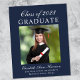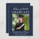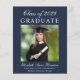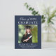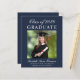 Eine preisgünstige, dunkelblaue Uni-Abschluss-Ankündigung mit dem Foto des Absolventen, seinem Namen und seinem Klassenjahr in einer eleganten weißen Schrift und seiner Universität, Hauptfach und Auszeichnungen in der modernen weißen Typografie.