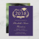 Eine budgetfreundliche formale Ankündigung des lila und goldenen Uni-Abschlusses mit dem Titel "Class of" in einer Illustration eines Lorbeerkranzes, der einen Graduiertenkopf und Diplom und den Namen des Absolventen in einem eleganten Drehbuch enthält. Fügen Sie ihre Schule, Dur, Ehren oder zukünftige Pläne in klassische Serifentypografie. Ihr Foto füllt die Rückseite der Karte aus. Dieses halbglänzende Haushaltspapier ist gewichtsähnlich wie Foto. Es ist auch eine größere 12x18-Kartenversion verfügbar (für den Link die Meldung).