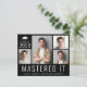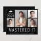 Haushaltsfreundliche Meister absolvieren schwarze Abschluss-Ankündigung und Party Einladung mit einer 4-Foto-Collage, "Mastered It" in großen weißen Buchstaben auf dem Boden geschrieben, und seine oder ihre Klasse Jahr, Name und Uni oder Universität in schlicht weißer Typografie. Auf der Rückseite fügen Sie die Details der Graduierungsparty hinzu.
