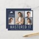 Eine preisgünstige, dunkelblaue Master-Abschluss-Ankündigung und Party Einladung mit einer 4-Foto-Collage, "Mastered It" in großen weißen Buchstaben und seinem Klassenjahr, Name und Uni oder der Universität in schlicht weißer Typografie. Auf der Rückseite fügen Sie die Details der Graduierungsparty hinzu.