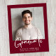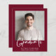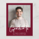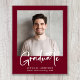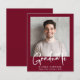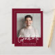 Eine preisgünstige, moderne bordeauxrote Abschluss-Ankündigung mit Foto und "Graduate" in einem stilvollen, fett-weißen Drehbuch. Fügen Sie den Namen, Schule und Klasse Jahr in der einfachen weißen Typografie.