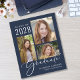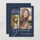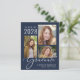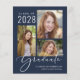 Eine preisgünstige, dunkelblaue Abschluss-Ankündigung mit einer 3-Bild-Foto-Collage und "Graduate" in einem stilvollen weißen Drehbuch. Fügen Sie den Namen, das Unterrichtsjahr und die Schule oder Universität in der modernen Typografie.