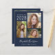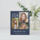 Budgetreue, dunkelblaue Abschluss-Ankündigung und Party Einladung mit einer 3-Foto-Collage, "Graduate" in einer stilvollen weißen Schrift, und der Name, Klasse Jahr und Schule oder Universität des Grafen in moderner weißer Typografie. Auf der Rückseite fügen Sie ein zusätzliches Bild und Ihre Graduierungsparty Details.
