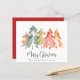 Eine preisgünstige, elegante Weihnachtskarte mit einem abstrakten Aquarell von Pinien in bestickter Weise grün, rot, goldfarben und orange und "Frohe Weihnachten" in einer stilvollen Schrift. Fügen Sie einen personalisierten saisonalen Gruß und Ihre Namen in einem signaturähnlichen Skript auf der Rückseite.