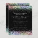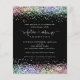 Zukünftige Frau Rainbow Glitzer Brautparty Black Einladung. Ein Preis SMALLER 4,5" x 5,6" Alternative. Erhältlich in einem SEMI GLOSS 110lb CARD STOCK, welches die Standardoption ist (empfohlen für Einladungen), ODER einem SATIN FINISH 80lb THINNER PAPER STOCK (ideal für Gehäuse). Umschläge sind optional und etwas größer als die Kartengröße. Die Zukunftsfrau ist in einem künstlerischen Set-Skript mit Ring- und Herzmotiven und der Erholung des Textes, den Sie leicht personalisieren können. An den oberen und unteren Rändern sind beide Seiten mit Glitzer in Regenbogenfarben begrenzt. Mit weißer Typografie auf schwarzem Hintergrund.
