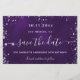 Eine glamouröse Save the Date-Karte für eine 50. Geburtstagsparty (oder jedes Alter). Ein lila, ungleicher Hintergrund. Dekoriert mit Imitaten silberner Glitzer Staub. Der Text: Save the Date ist mit einem großen angesagten, handgeschriebenen Stilskript geschrieben.