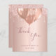 Eine Dankeschön-Karte für einen Sweet 16, 16. Geburtstag. Eine Rose Gold Imitate metallisch aussehende Hintergrundfarbe. Mit Imitaten Glitzer Tropfen, Farbe Tropfen Aussehen und Ballons. vorne große dunkle Rose goldfarbene handgeschriebene Schrift und der Text: Danke, Ihr Text, Titel und ein Datum. Zurück: Vorlage für Ihren Dank Notiz und Name.