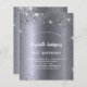 Eine moderne, stilvolle und glamouröse Einladung für eine 21. Geburtstagsfeier (oder jedes Alter). Ein dunkles Imitat silber metallisch aussehender Hintergrund mit Imitat Glitzer, Glitzern. Der Name ist mit einem modernen handgeschriebenen Stilskript geschrieben. Personalisieren Sie Ihre Party-Daten und fügen Sie sie hinzu.