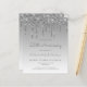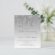 This trendy 25th wedding anniversary party invitation features a sparkly silver faux glitter drip border and silver ombre background. The words "25th Anniversary" and the first names of the couple appear in casual silver gray handwriting script, with the rest of the customizable text in sans serif font. The same silver glitter drip design appears on the reverse side.