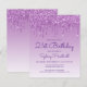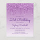 Diese trendige 21. Geburtstagsfeier-Party Einladung mit einem funkelnd lila Imitat Glitzer Tropfen Rand und lila ombre Hintergrund. Die Worte "18. Geburtstag" und der Name des Ehrengast erscheinen in lässiger lila Handschrift, mit der Erholung des anpassbaren Textes in serifenlosen Schriftart. Auf der Rückseite wird das gleiche Design für den lila Glitzer-Tropfen angezeigt.
