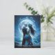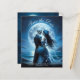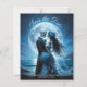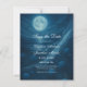 This elegant gothic budget wedding save the date announcement card features a skeleton couple wearing blue wedding attire in a romantic setting with the moon and ocean behind . The back of the card has your wedding details with a matching image. Image generated with AI.