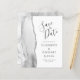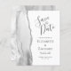Der links Rand dieser eleganten modernen Hochzeit speichern Sie die Dattelkarte mit einem grau-weißen Aquarellrahmen in Aquarellfarbe, der mit Imitaten silbernen Glitzer beschnitten ist. Der individuell anpassbare Text kombiniert handgeschriebene Holzkohle, Kupferplatte und kursiv Schriftart auf weißem Hintergrund. Auf der Rückseite ist ein passendes grau- und silberfarbenes Design erkennbar.