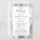 This elegant, modern wedding program fan features a gray and white agate background trimmed with gold faux glitter. The text appears in elegant charcoal gray handwriting and copperplate fonts on a white rectangle.