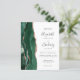 The left-hand edge of this elegant modern wedding invitation features an emerald green watercolor agate border trimmed with faux rose gold glitter. The customizable text combines charcoal gray handwriting, copperplate and italic fonts on a white background. The reverse side provides spaces for 4 photos (1 square, 2 horizontal, 1 long vertical) and room for your wedding website URL or other information.