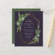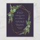 Schick Sommer-Budget Hochzeitseinladung mit botanischem Aquarell und Imitaten goldener geometrischer Rahmen mit stilvoller und moderner Typografie, die Ihre Details vor einem dunklen lila Hintergrund zeigt. Diese Einladung kehrt zu einem dunkelgrünen Hintergrund mit einem zarten botanischen Muster zurück.