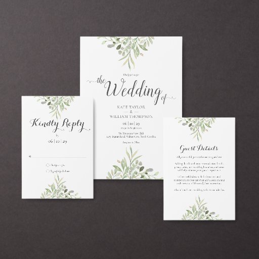 Mit feinen Blätter im Aquarell. Diese elegante botanische Hochzeitseinladung kann mit Ihren speziellen Informationen zum Hochzeitstag personalisiert werden. Sie können ein Foto auf der Rückseite hinzufügen. Entwickelt von Thisisnotme©