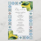 Dieses preiswerte Hochzeitsmenü bietet Aquarelllemons in Gelbtönen mit einem Amalfi Fliesenmuster in Blau- und Rosttönen. Das Wort "Menü" ist Set in Kalligraphie-Skript. Fügen Sie mithilfe der Vorlagenfelder benutzerdefinierte Menüelemente hinzu. Ideal für Hochzeiten in Italien und im Sommer, für Proben-Dinner, Verlobungsfeiern und vieles mehr. Einzigartige Kunst und Design von Victoria Grigaliunas do Lema - Monte Brè