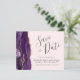 Diese elegante Save the Date-Karte verfügt über eine lila Aquarell-Grenze mit Imitaten vergoldeten Glitzer besticht. Der anpassbare Text kombiniert handgeschriebene handgeschriebene Schrift aus Holzkohle, Kupferplatte und kursiv Schriftart auf einem rot-rosa Hintergrund. Auf der Rückseite ist ein lila und goldenes Design zu sehen.