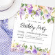 Ehre eine besondere Frau mit dieser eleganten und weiblichen Geburtstagsfeier. Die Geburtstagsfeierlichkeiten sind von oben und unten lila Blumenrahmen umgeben. Die Blumenelemente sind in tiefgrüne Blätter eingebettet. Während es sich um ein traditionelles Design handelt, verleihen das offene und luftige botanische Blattwerk und der Text ihm ein zeitgenössisches Ambiente. Dieser Artikel ist Teil der rustikalen Lila floralen botanischen Sammlung.