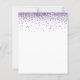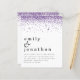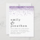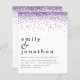 Lila Glitzer Confetti Hochzeitseinladung. Ein Preis SMALLER 4,5" x 5,6" Alternative. Umschläge sind optional und etwas größer als die Kartengröße. Ihre Vornamen sind groß in stilvollen Kleinbuchstaben mit den Details unten. Personalisieren Sie den Text einfach. An beiden Seiten oben ist eine Glasgrenze von Imitaten Glitzer Konfetti in lila.