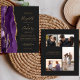 Der links Rand dieser eleganten, modernen Hochzeitseinladung zeichnet sich durch eine lila Aquarellgrenze aus, die mit Imitaten mit goldenem Glitzer bestickt wurde. Der anpassbare Text kombiniert goldfarbene Handschrift, Copperplate und kursiv Schriftart auf einem schwarzen Hintergrund. Die Rückseite bietet Platz für 4 Fotos (1 Quadrat, 2 horizontale, 1 lange vertikale) und Platz für Ihre Hochzeitswebsite URL oder andere Informationen. HINWEIS: Umschläge sind nicht automatisch in diese Einladungen mit dem Budget eingeschlossen. Bitte denken Sie daran, die Option "weiße Umschläge" zu wählen!
