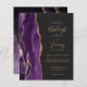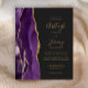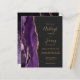 Der links Rand dieser eleganten, modernen Hochzeitseinladung zeichnet sich durch eine lila Aquarellgrenze aus, die mit Imitaten mit goldenem Glitzer bestickt wurde. Der anpassbare Text kombiniert goldfarbene Handschrift, Copperplate und kursiv Schriftart auf dunkelkohlegrauem Hintergrund. Auf der Rückseite ist ein lila und goldenes Design zu sehen.