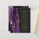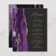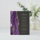 Die links Seite dieses eleganten, modernen Hochzeitsmenüs besticht durch ein lila Aquarelldesign mit vergoldetem Imitat-Glitzer. Der anpassbare Text kombiniert goldfarbenes Handschriftskript und singt serifenlose Schriftart auf schwarzem Hintergrund mit dunkelschiefer Schrift. Das lila und goldene Agerat-Design wird auf der Rückseite wiederholt.