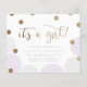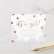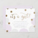 Budget Lila & Gold Confetti Girl Baby Shower Einladungen mit leicht anpassbaren Vorlagen von Eugene Designs. Dieses niedliche Babyduschdesign besticht durch Imitate mit goldfarbenem Glitzer-Kalligraphie-Schriftart mit einer modernen, einfachen Typografie in Grau und Lavendel, lila auf weißem Hintergrund.