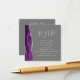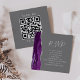 Der links Rand dieser eleganten, modernen Hochzeitswebseite Umschließkarte zeichnet sich durch eine lila Aquarellgrenze aus, die mit Imitaten silbernen Glitzer bestickt ist. Der Titel erscheint in silbergrauem Schriftzeichen, darunter kann der Text im Schriftart kopperplate auf grauem Hintergrund angepasst werden. Laden Sie den QR-Code Ihrer Hochzeitswebsite hoch, um das Beispielbild auf der Rückseite zu ersetzen, gerahmt durch die Worte "scanne mich auf UAWG".