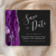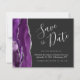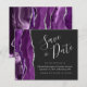 Diese elegante Budget Save the Date Karte verfügt über eine lila Aquarellgrenz mit Imitaten silbernen Glitzer bestickt. Der anpassbare Text kombiniert silbergraue Handschrift-Skripte und Copperplate-Schriftart auf einem schwarzen Hintergrund. Auf der Rückseite ist ein lila und silberfarbenes Design erkennbar.