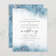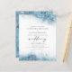 Diese elegante Hochzeitseinladung zeichnet sich durch ein hellblaues Aquarellbild aus, in dem Marmor nachgeahmt wird, das mit silbernen Imitaten verziert ist und allmählich in den weißen Hintergrund verblasst. Das Wort "Hochzeit" erscheint in einem handgeschriebenen Holzkohle-Grauschrift, der Rest in Serif-Hauptstädte. Das blaue und silberne Marmormuster wird auf der Rückseite der Karte wiederholt.